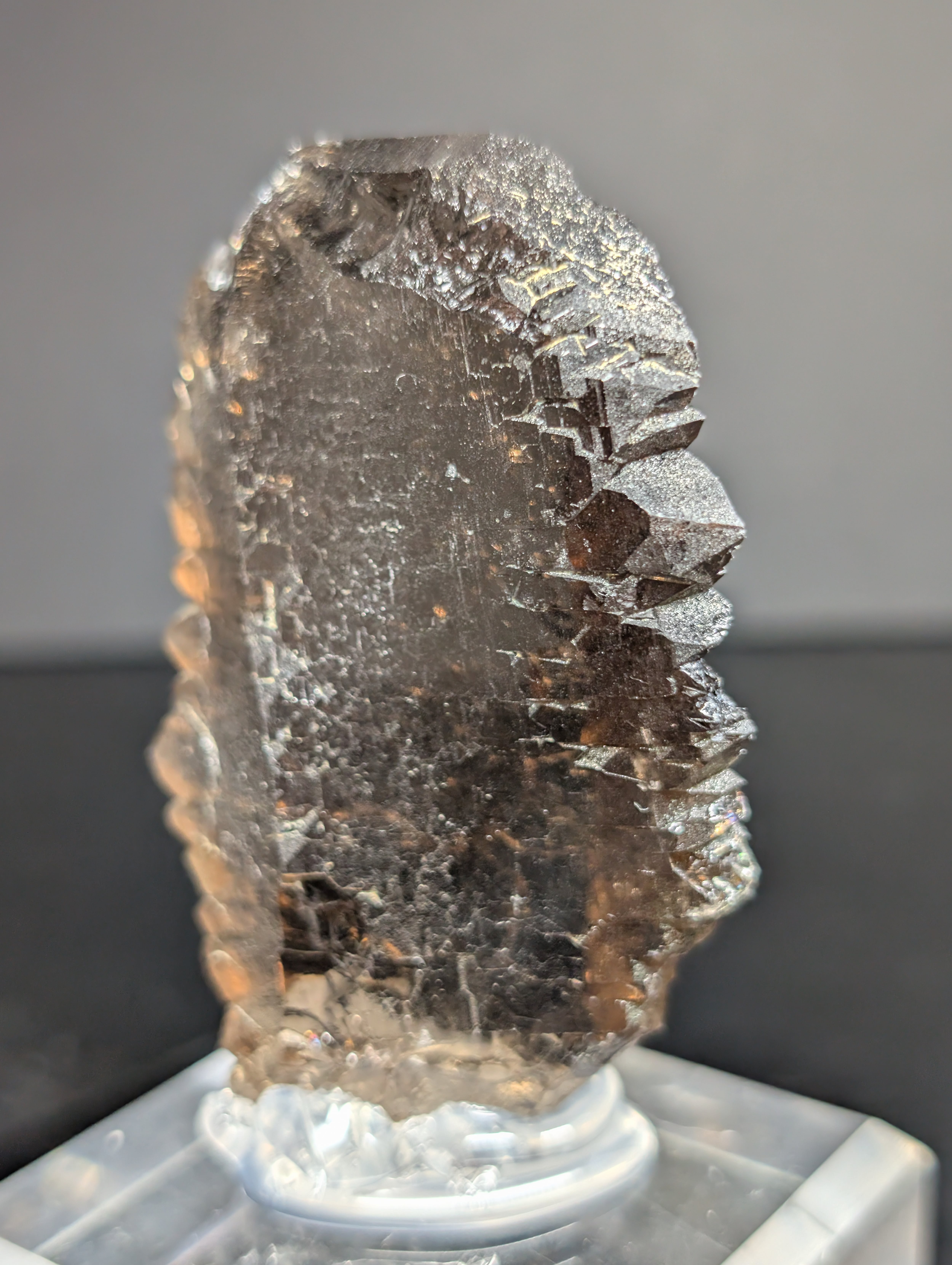 淡いスモーキーグレーの輝きと、表面に付着したクローライト(緑泥石)のアクセントが調和し、落ち着いた品格を感じさせる逸品です。高さのある整った結晶フォルムを保つ、美観・希少性ともに優れたスイス産標本です。